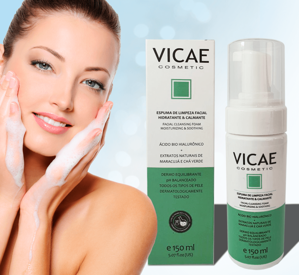 Espuma de limpeza facial VICAE, a melhor maneira de limpar e proteger a pele, graças à ação combinada do poder de hidratação profunda do ácido Bio Hialurônico VICAE, com as propriedades calmante, remineralizante, refrescante e antirradicais livres dos extratos de maracujá e chá verde. A perfeita sinergia dos seus ativos em uma formulação de limpeza suave e profunda, promove hidratação, maciez, controle da oleosidade, equilíbrio do pH e varredura dos radicais livres, purificando e tonificando todos os tipos de pele.